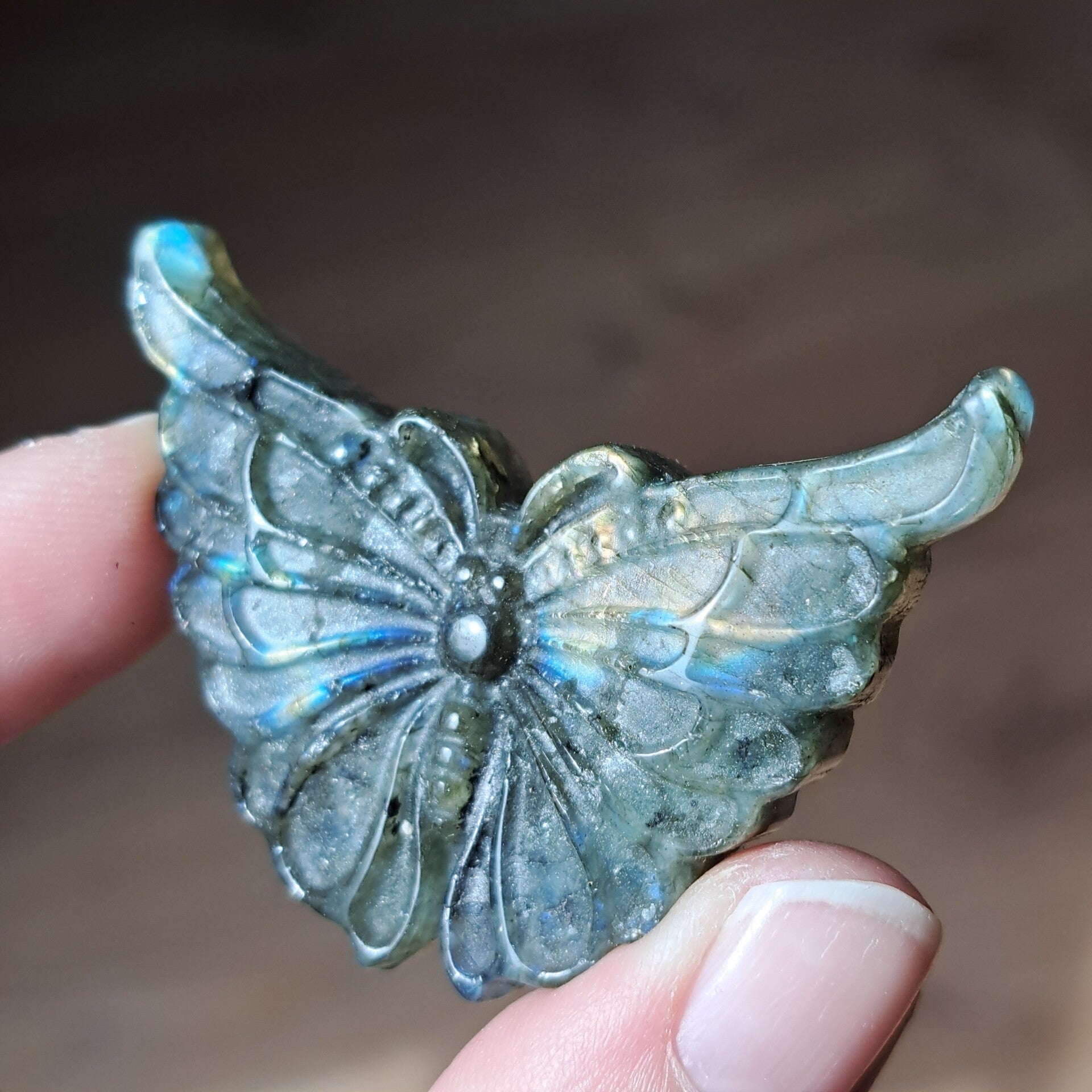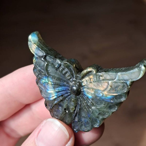 De vlinder staat symbool voor transformatie, groei en het volgen van je eigen pad. In combinatie met labradoriet, een steen die bekend staat om haar beschermende en intuïtieversterkende energie, ontstaat een krachtig geheel.