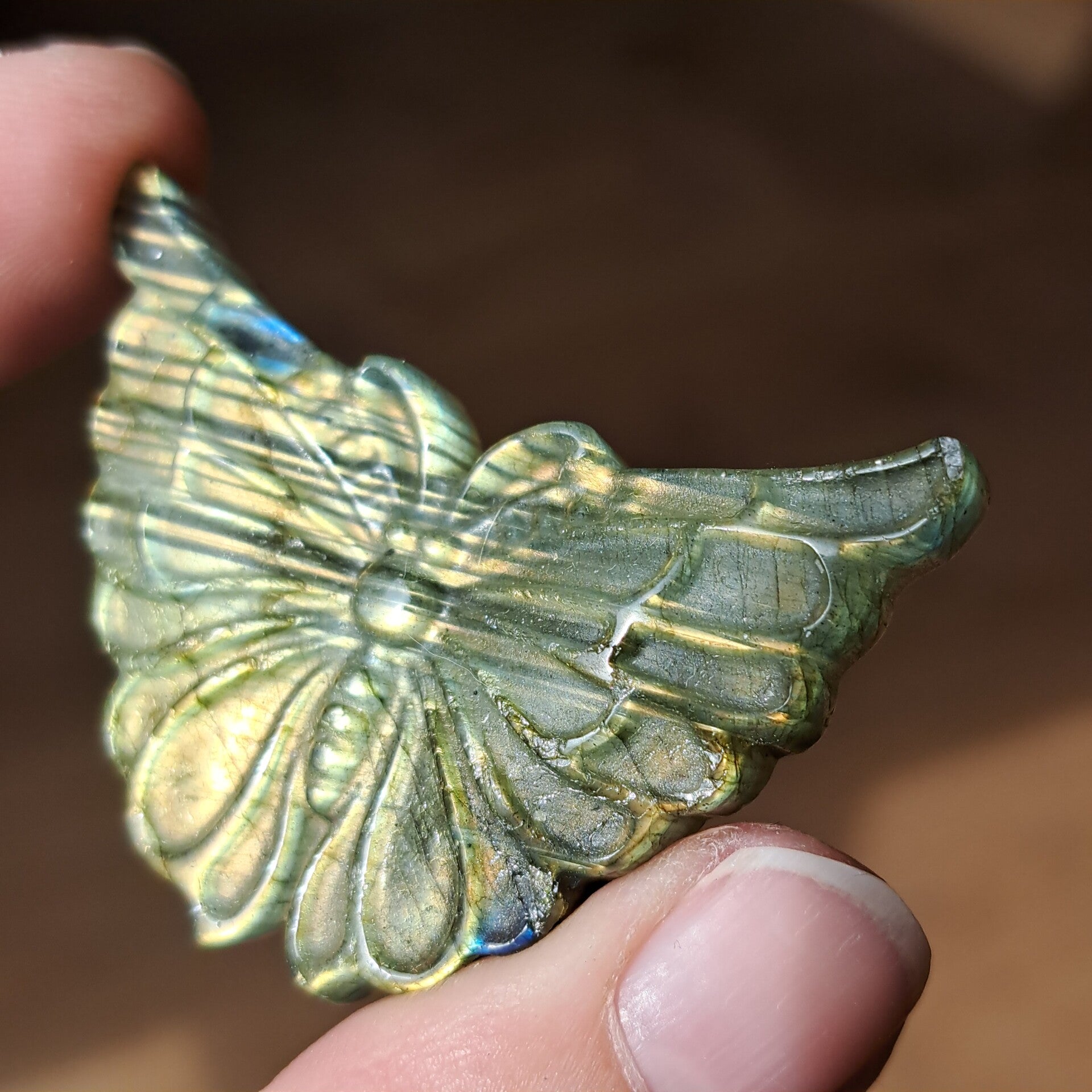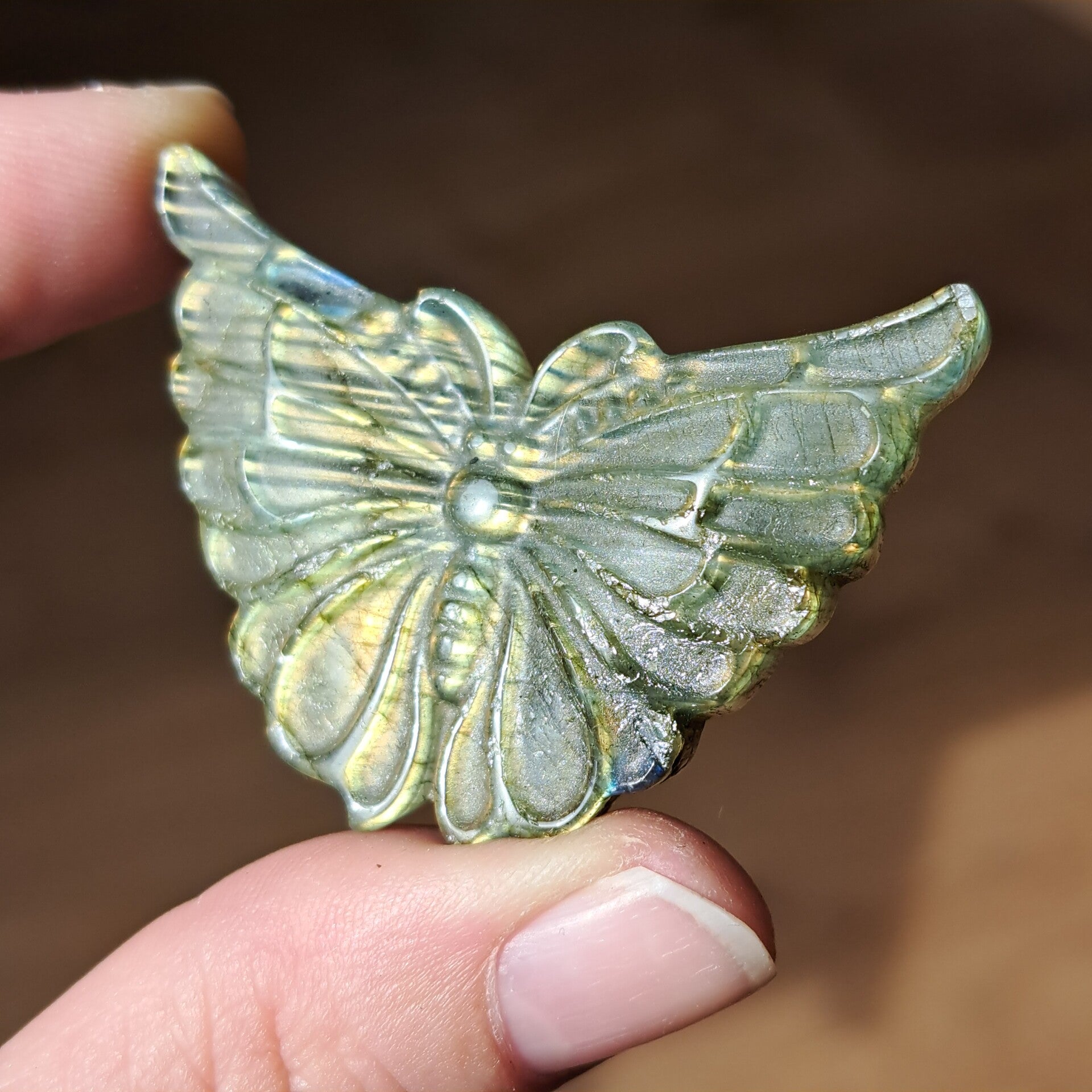 De vlinder staat symbool voor transformatie, groei en het volgen van je eigen pad. In combinatie met labradoriet, een steen die bekend staat om haar beschermende en intuïtieversterkende energie, ontstaat een krachtig geheel.