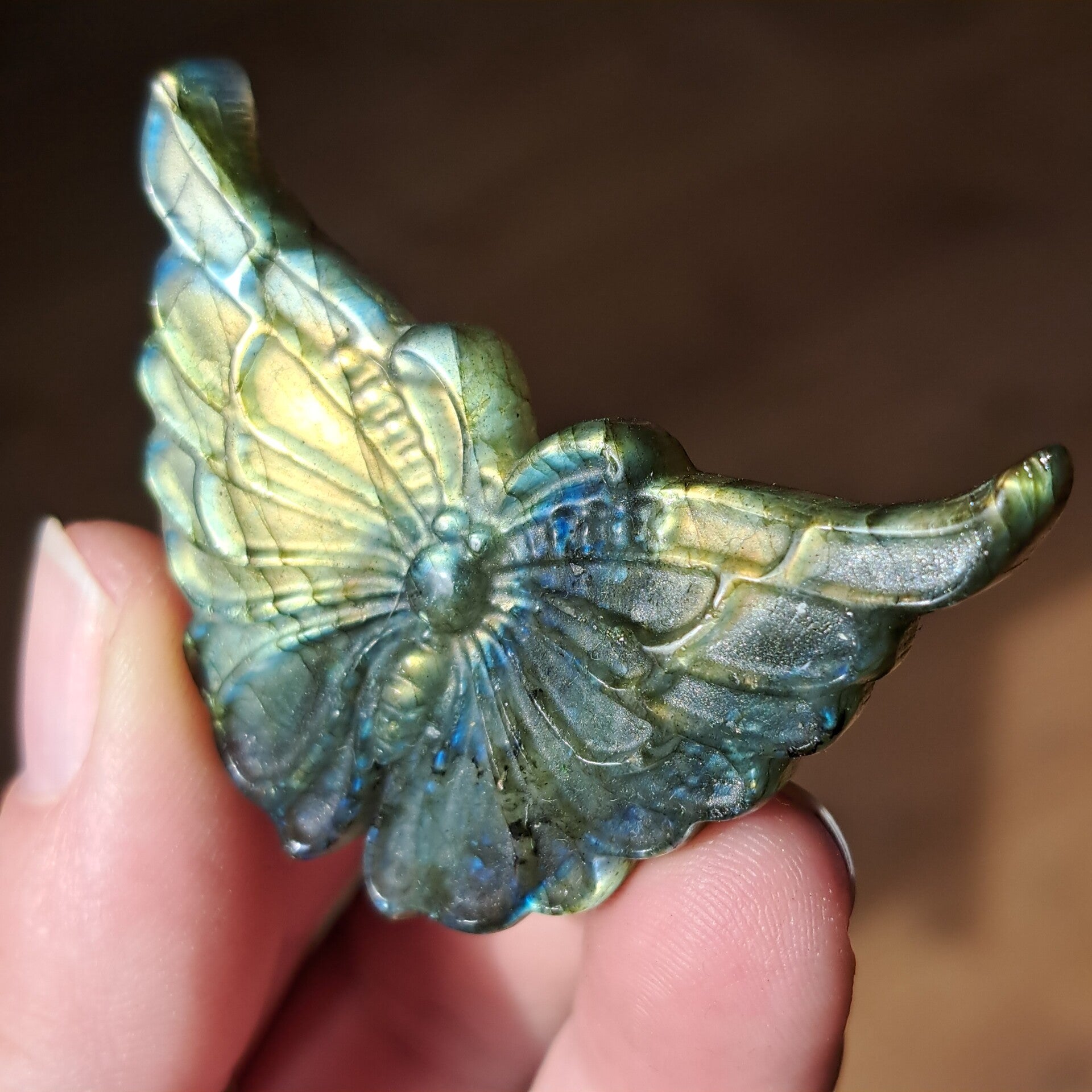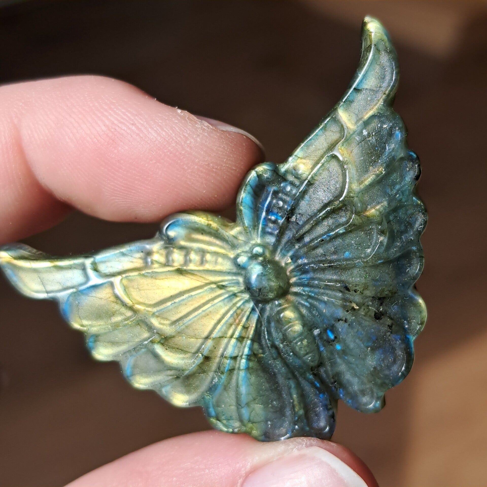 Deze met zorg geslepen vlinder van circa 5 cm vangt het licht op een bijzondere manier. De kenmerkende schittering van labradoriet laat zich telkens anders zien, alsof ze je herinnert aan de lagen die ook in jezelf verborgen liggen.