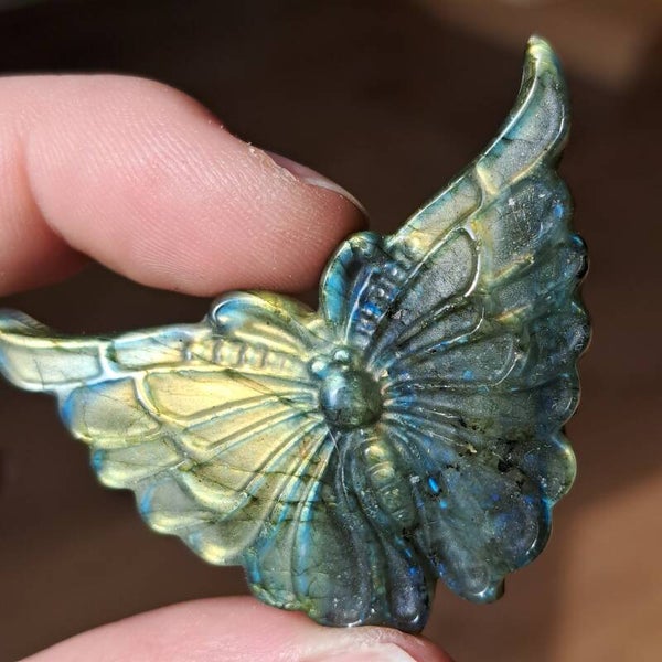 De vlinder staat symbool voor transformatie, groei en het volgen van je eigen pad. In combinatie met labradoriet, een steen die bekend staat om haar beschermende en intuïtieversterkende energie, ontstaat een krachtig geheel.