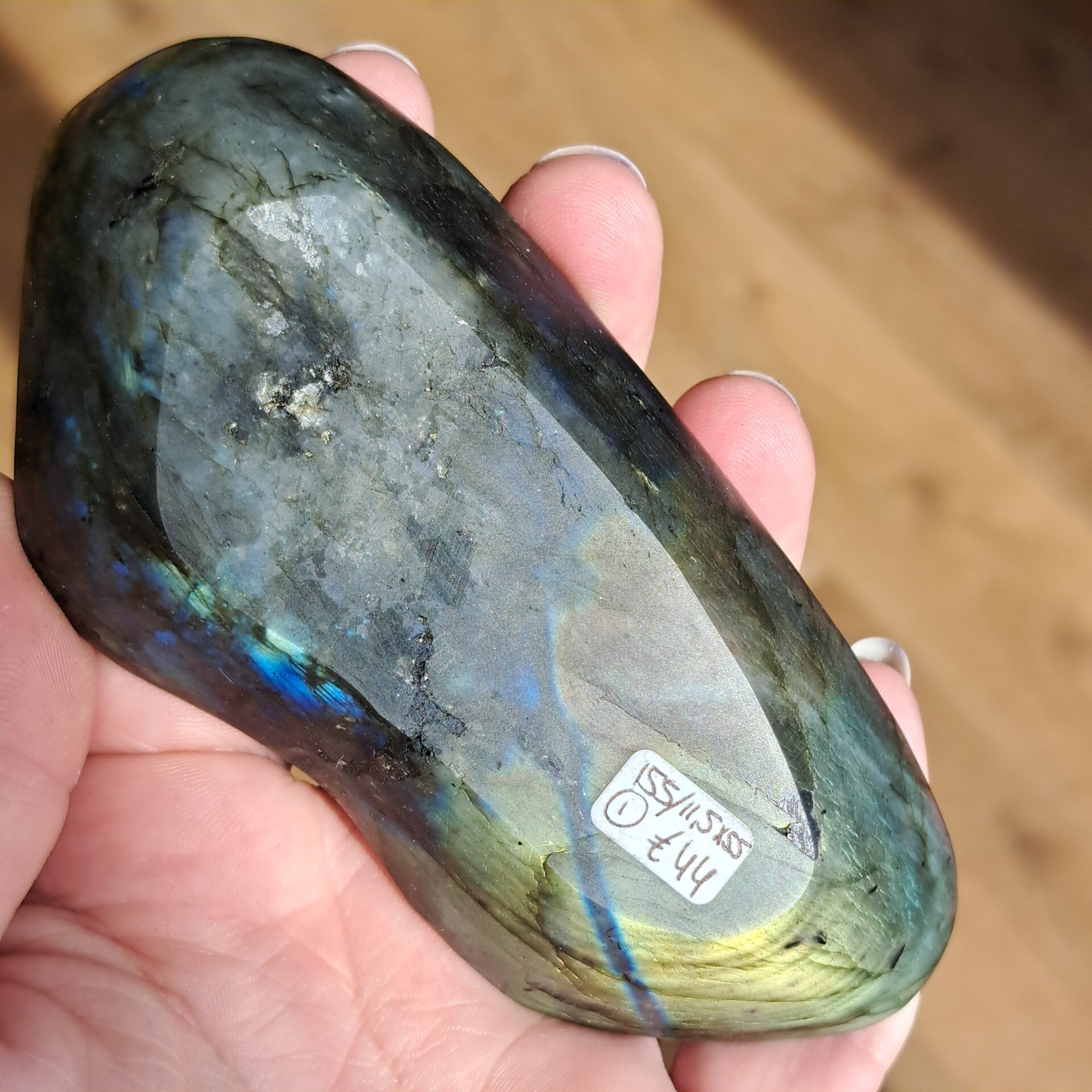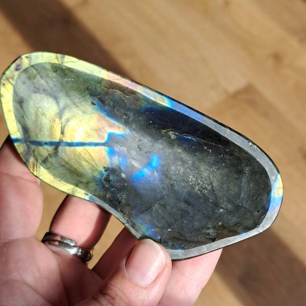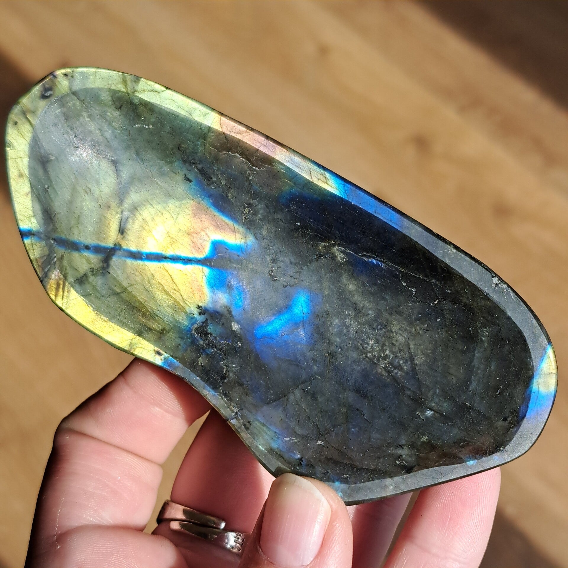 Een bijzondere schaal van labradoriet, waarin licht en diepte samenkomen in een bijna vloeibaar kleurenspel. Flitsen van helder blauw en goud lijken als een zachte stroom door de steen te bewegen, terwijl de donkerdere basis zorgt voor rust en balans.