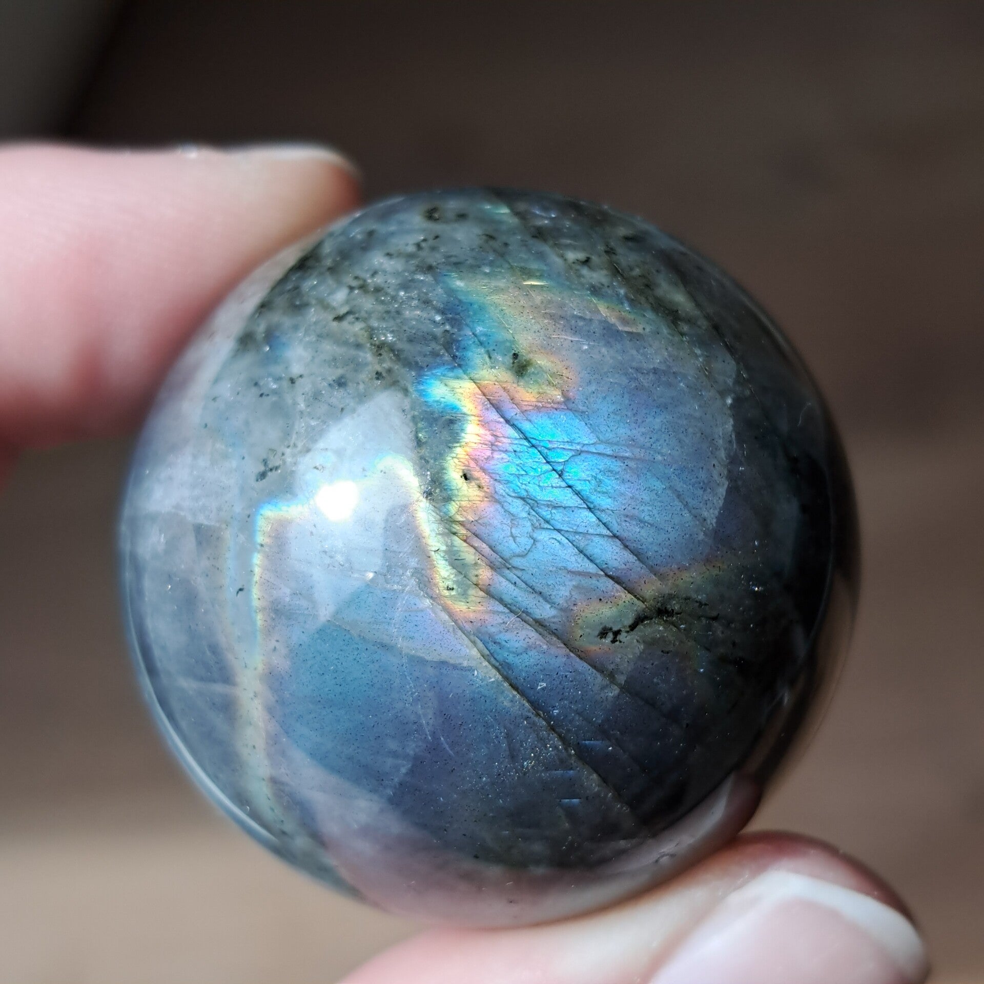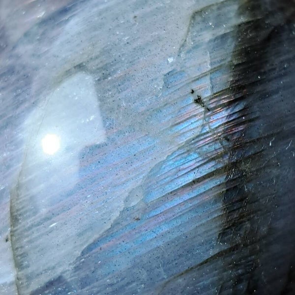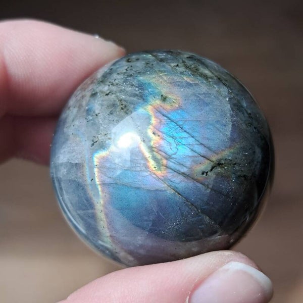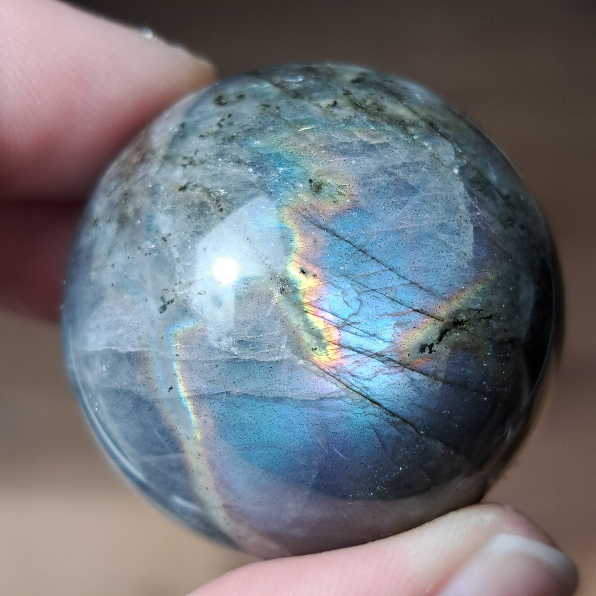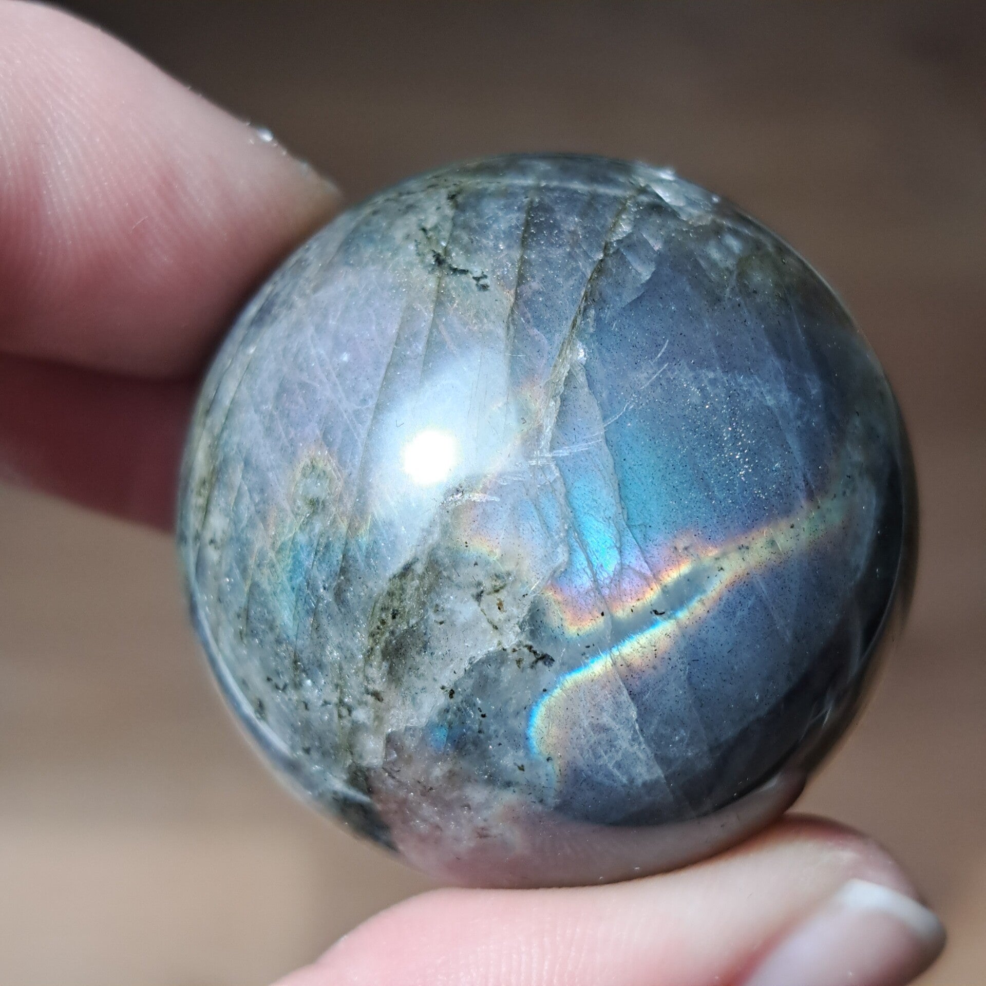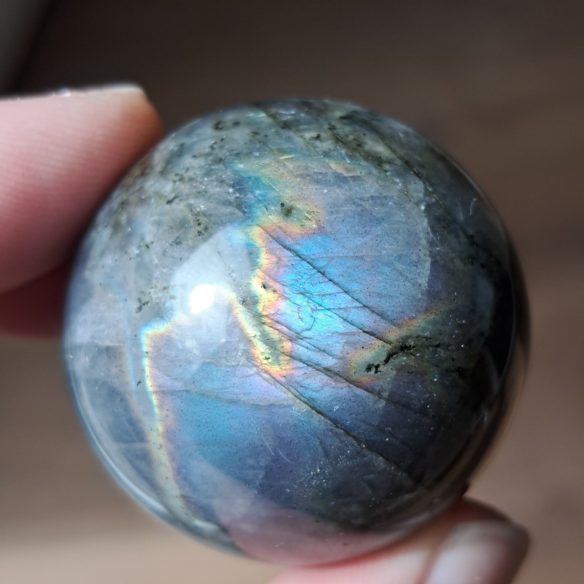 De glans in deze labradorietbol komt naar voren in zachte, vloeiende banen van blauw met daaroverheen een subtiele regenbooglijn. Niet één vaste flits, maar een beweging van kleur die verandert met het licht, alsof ze steeds iets nieuws laat zien, afhankelijk van hoe je haar bekijkt.