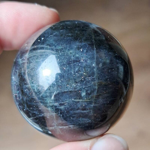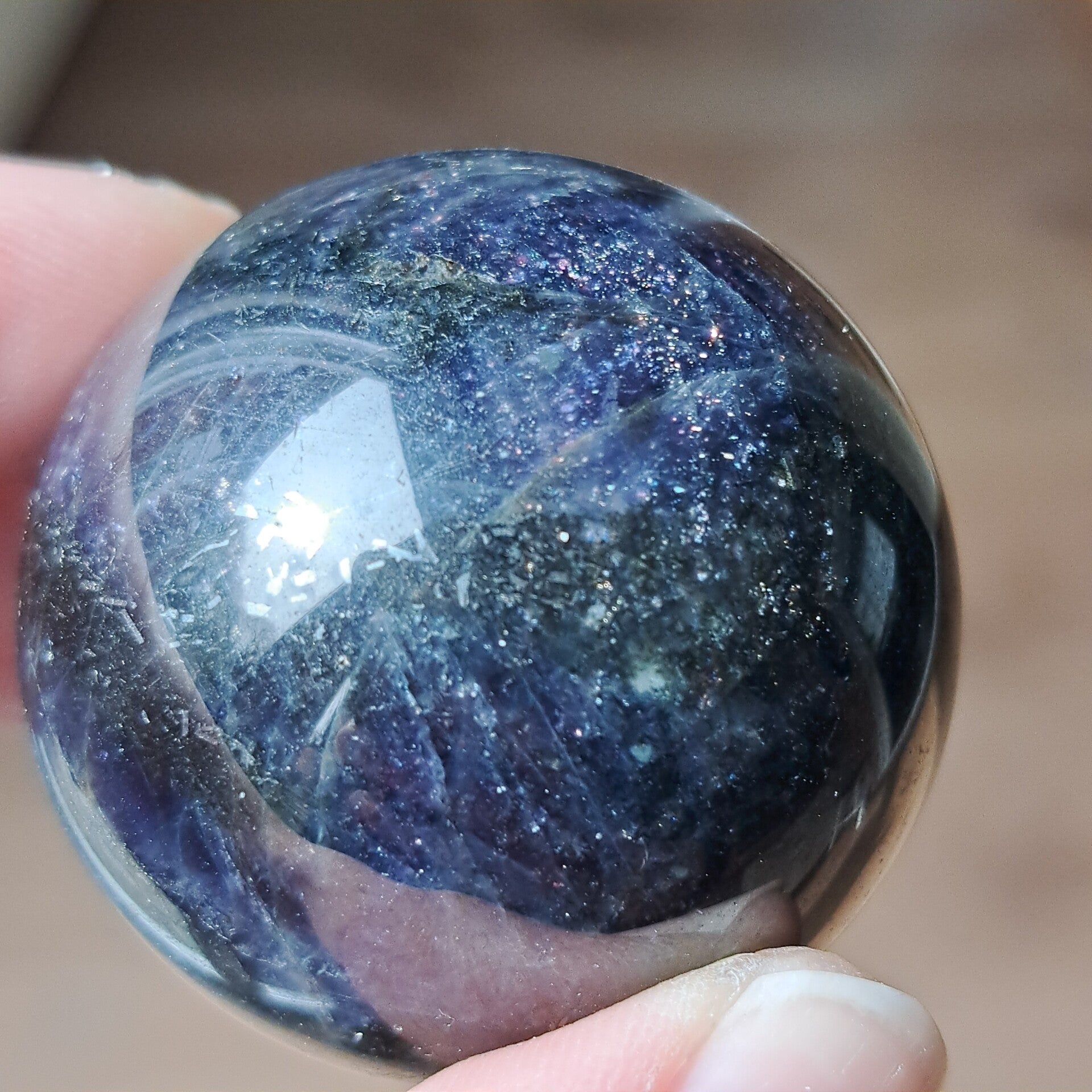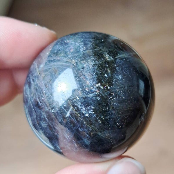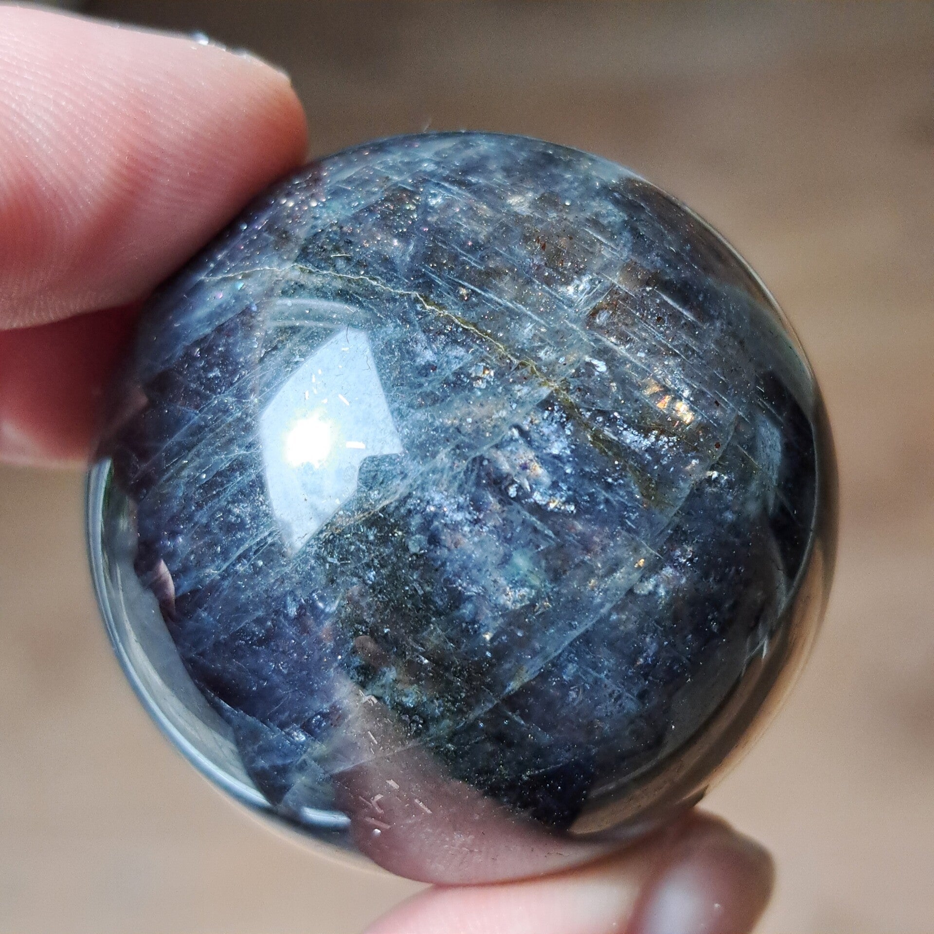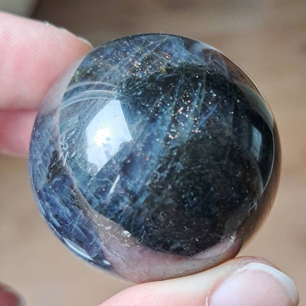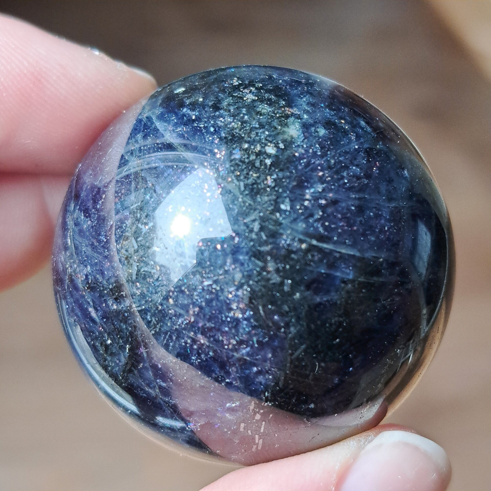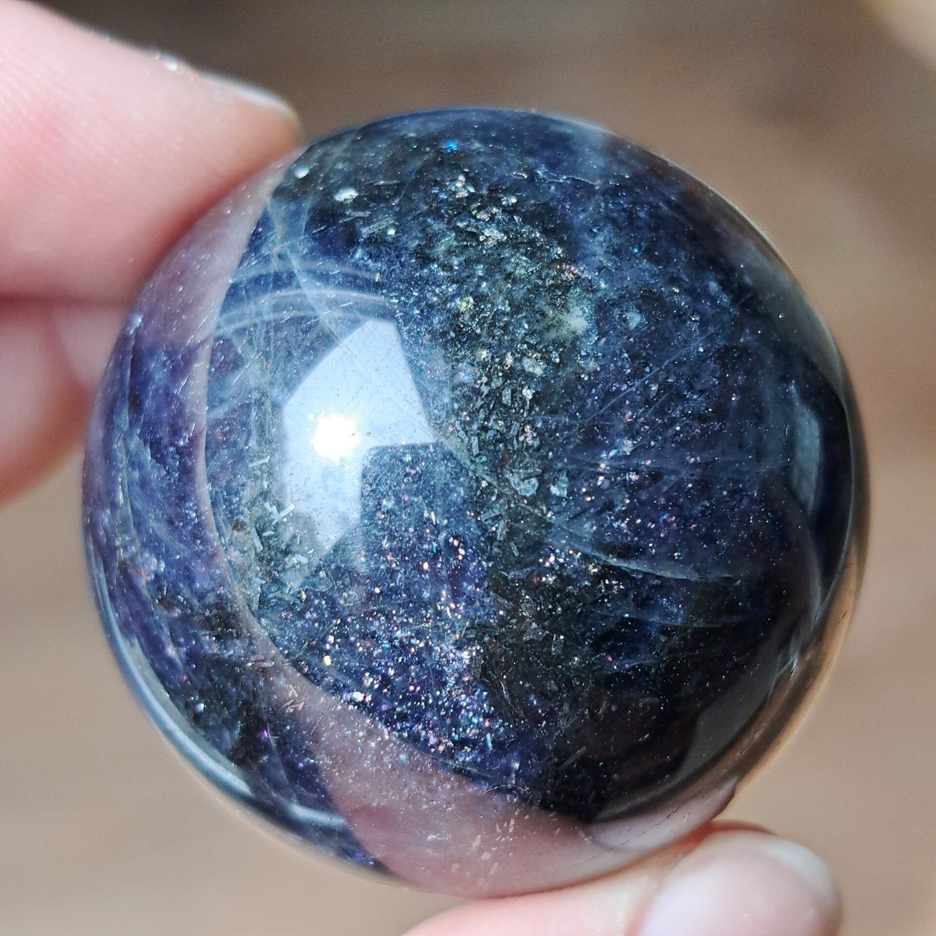 Deze ioliet bol draagt een diepe, bijna nachtelijke energie. De kleuren bewegen tussen intens blauw, paars en inktachtige tinten, met daarin talloze kleine fonkelingen die doen denken aan een sterrenhemel. Alsof je in de steen zelf een universum kunt ontdekken.