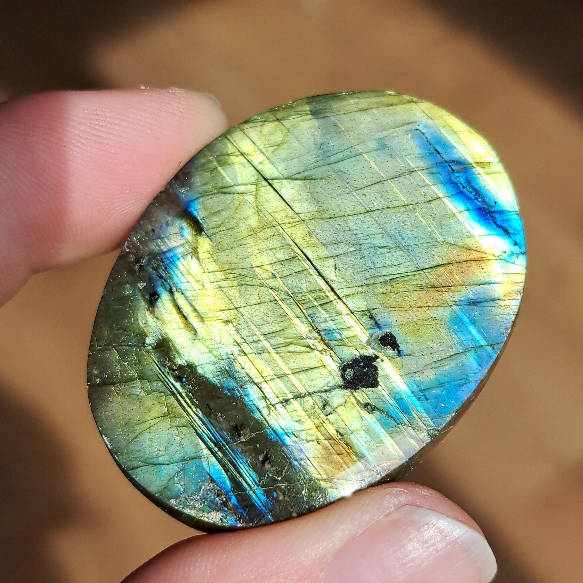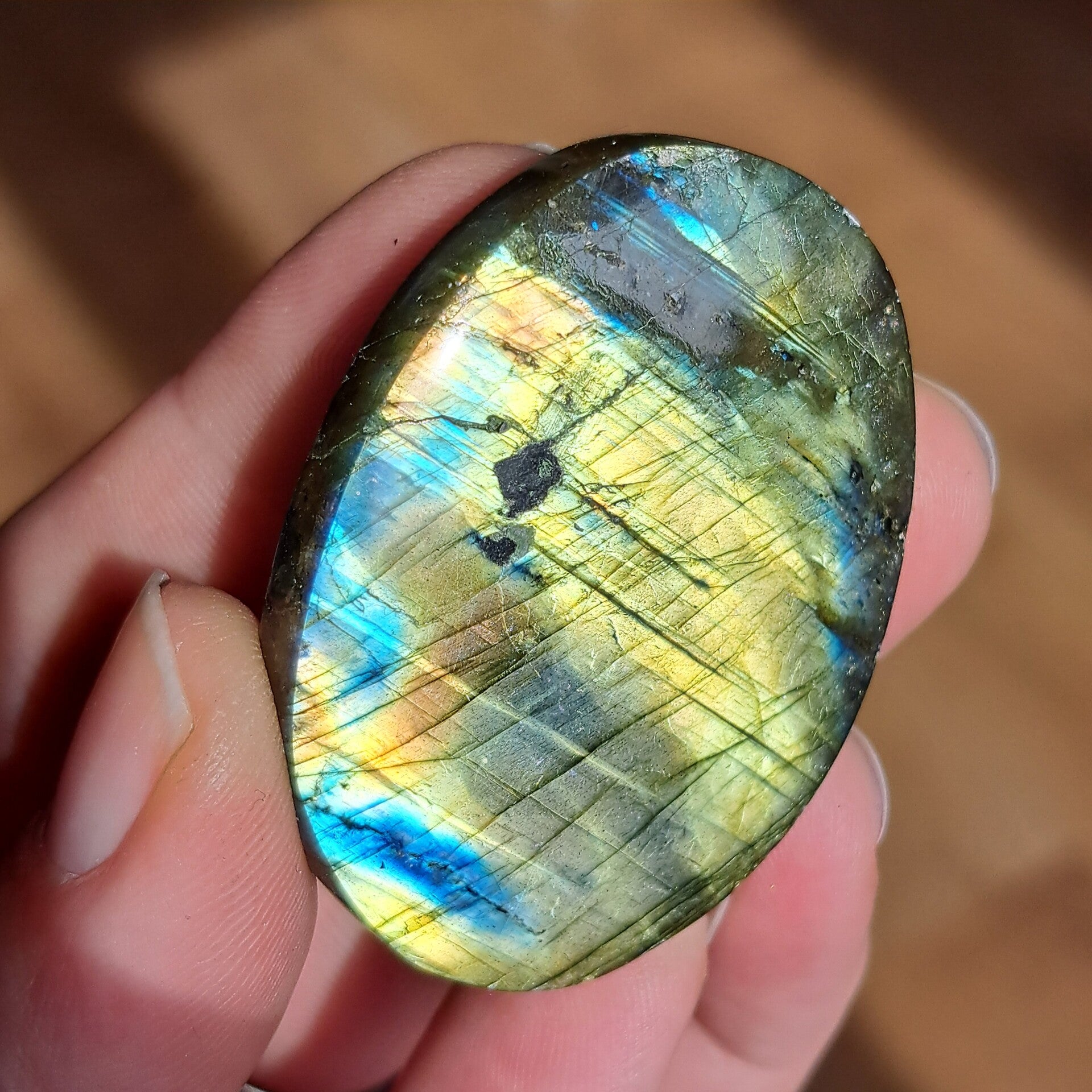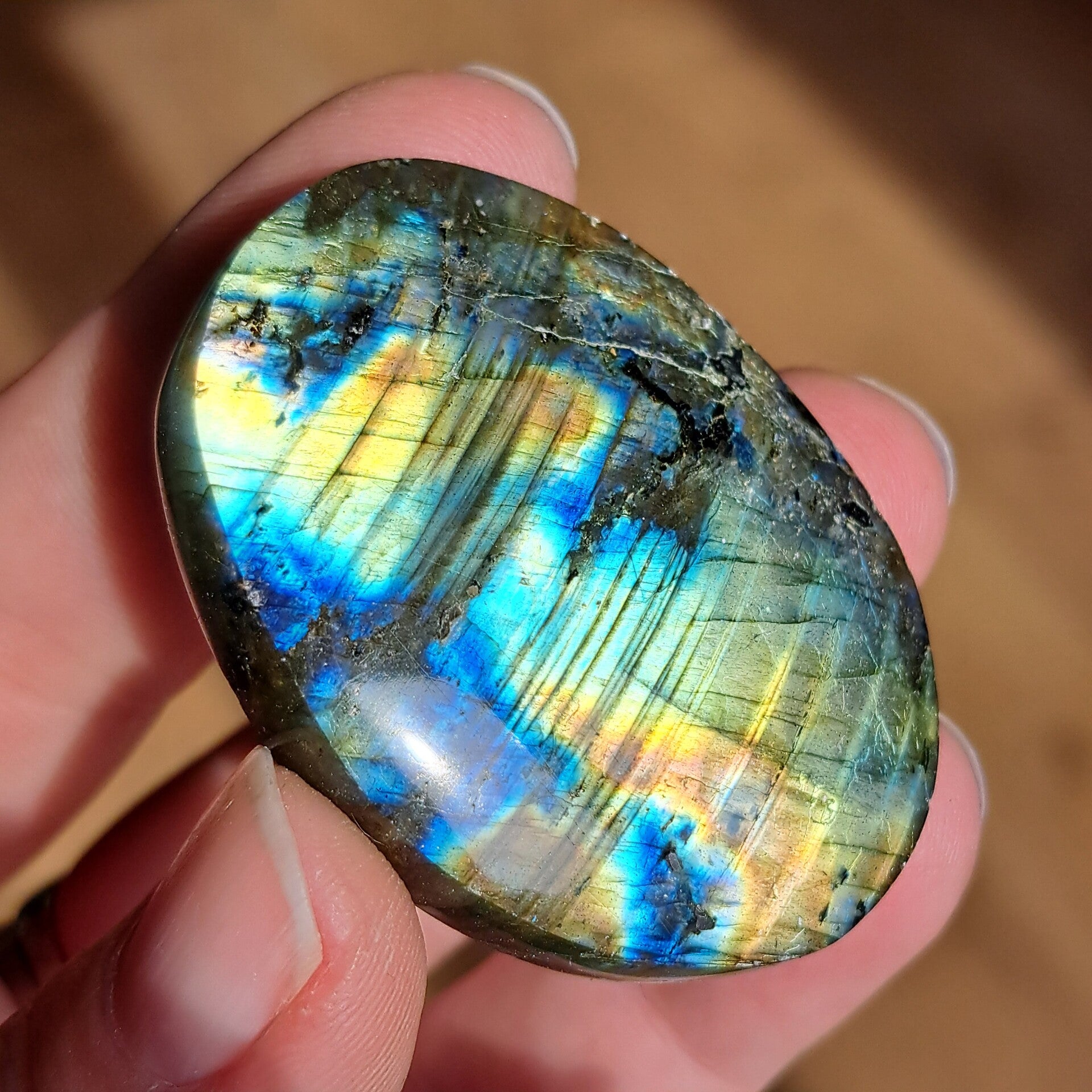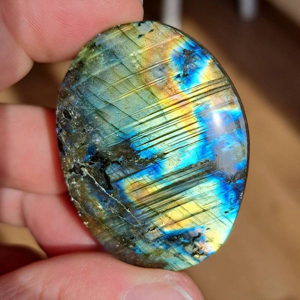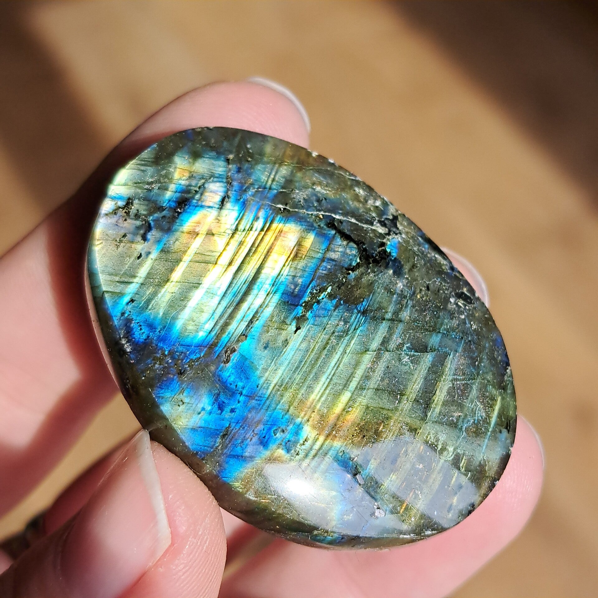 Deze labradoriet palmsteen draagt een intense, levendige flash die bijna het hele oppervlak tot leven brengt. Kleuren van diep oceaanblauw, helder turquoise en warm goud lopen in elkaar over als lichtgolven, alsof het noorderlicht gevangen zit in steen.
