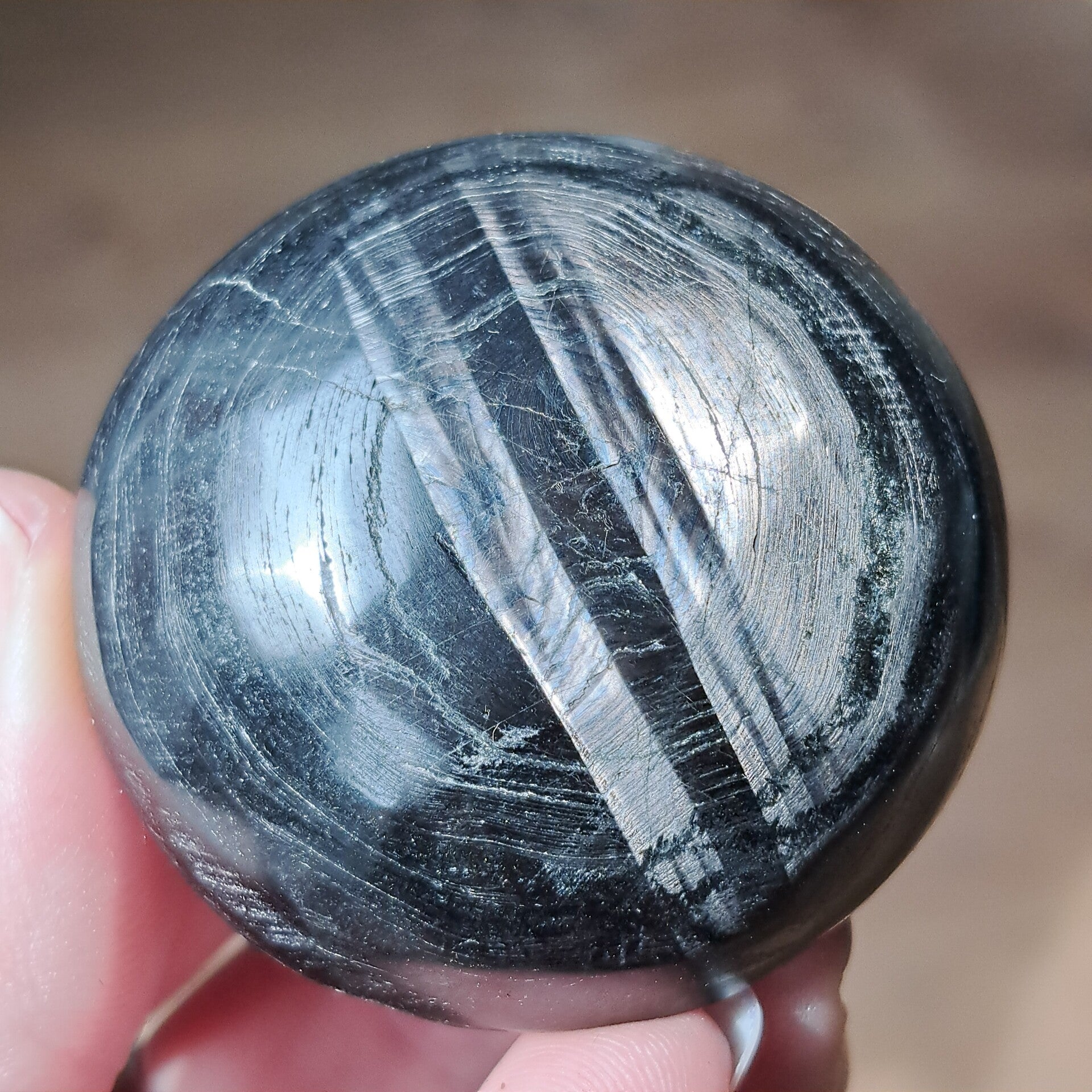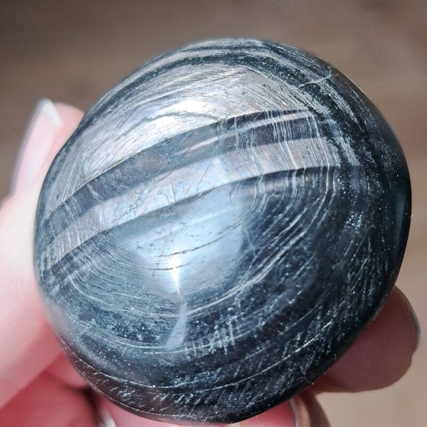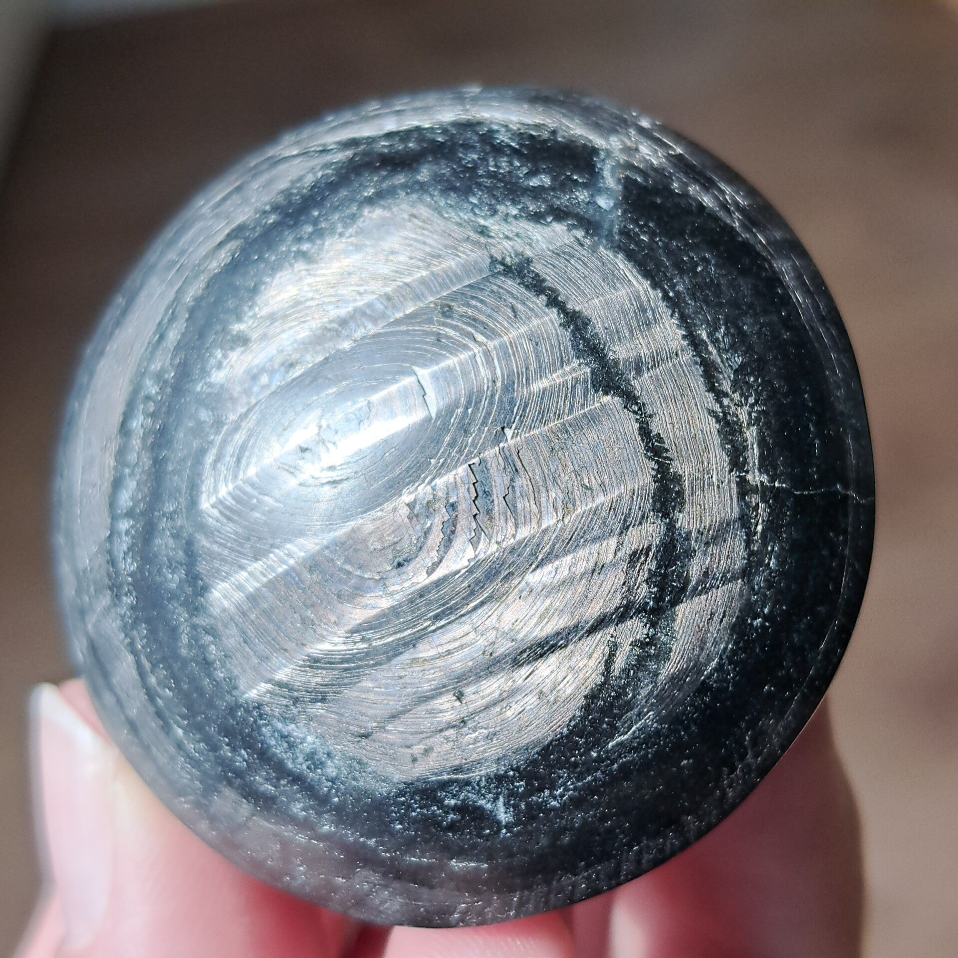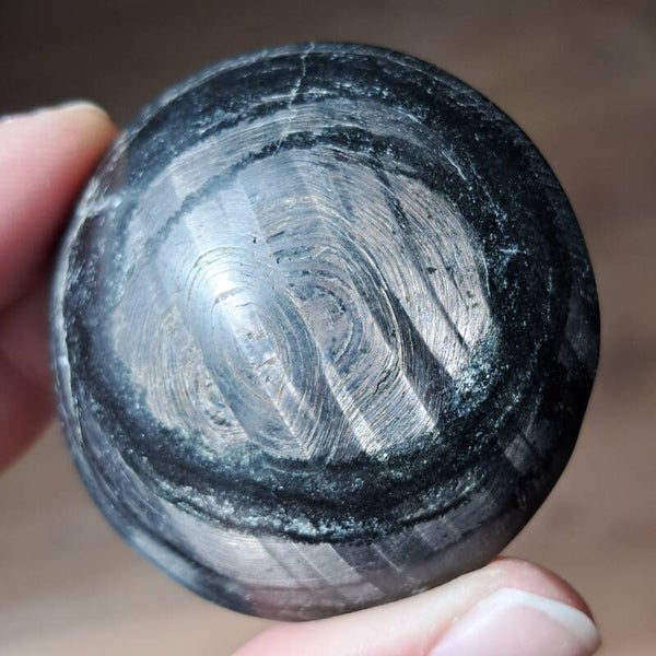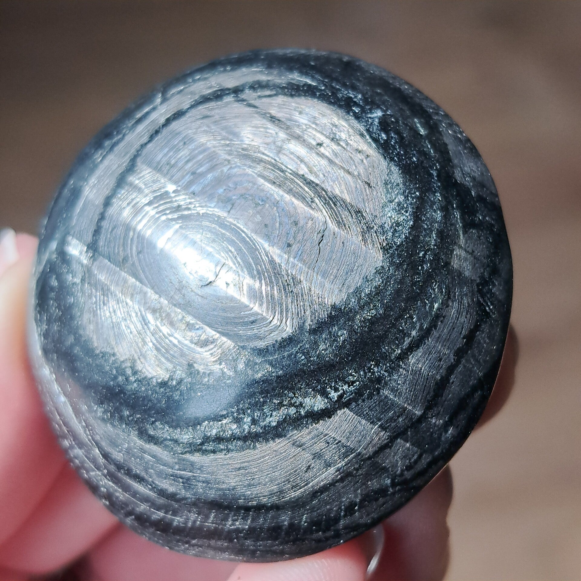 Wat direct opvalt zijn de ronde, bijna spiraalvormige structuren in de steen. Lagen die als ringen door elkaar heen lopen, alsof de tijd zelf in haar is vastgelegd. De donkere banden die door de steen bewegen geven haar een krachtige aarding, terwijl de zilvergrijze glans juist zachtheid en diepte brengt.