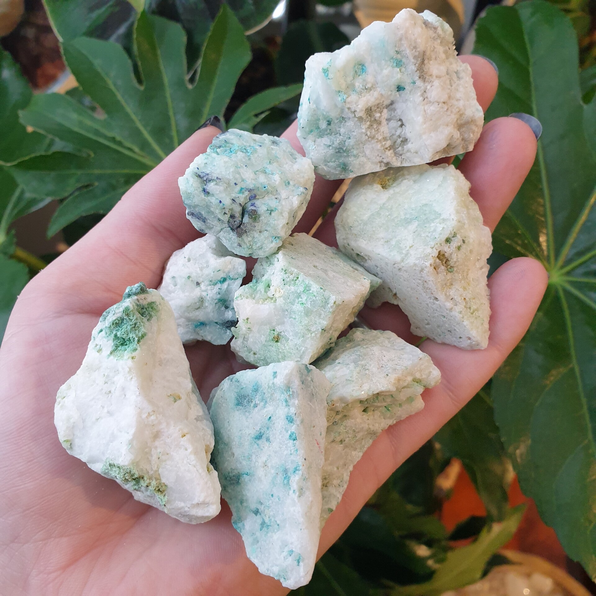 Deze mooie grote ruwe brokken varieren van 4 tot 5,5 centimeter komen uit Amerika en hebben de werking van zowel quartz als van chrysocolla en staan symbool voor Persoonlijke kracht & Zelfontwikkeling.