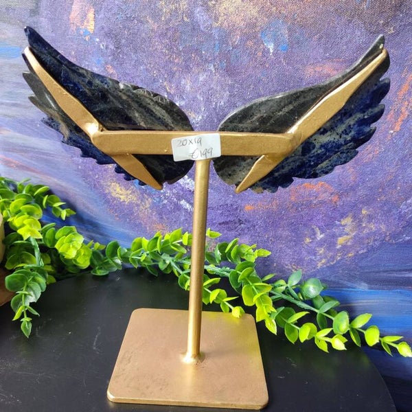 Deze vleugels zijn van sodaliet en zijn in totaal 20x19 centimeter groot. Uiteraard zijn ze ook uit de houder te halen, zo worden ze ook verzonden.