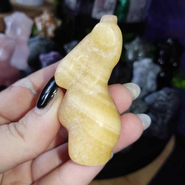 Deze mooie curvy dame van gele calciet is 6,5 cm groot.