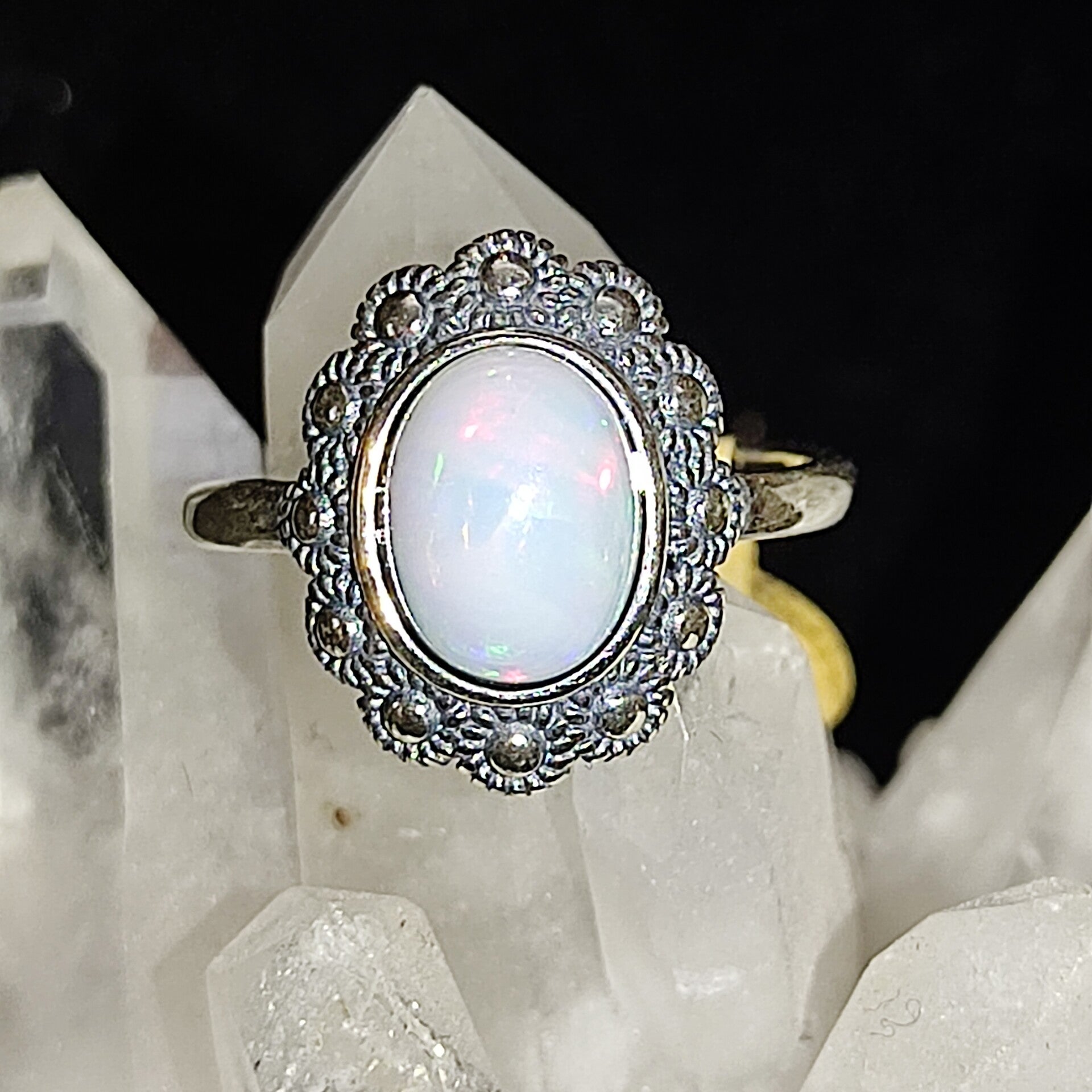 En kijk nou, dat kan toch ook niet anders? Prachtige kleurschakeringen in deze ring van Opaal in een zetting van zilver wat lijkt op een zeeuws knopje.