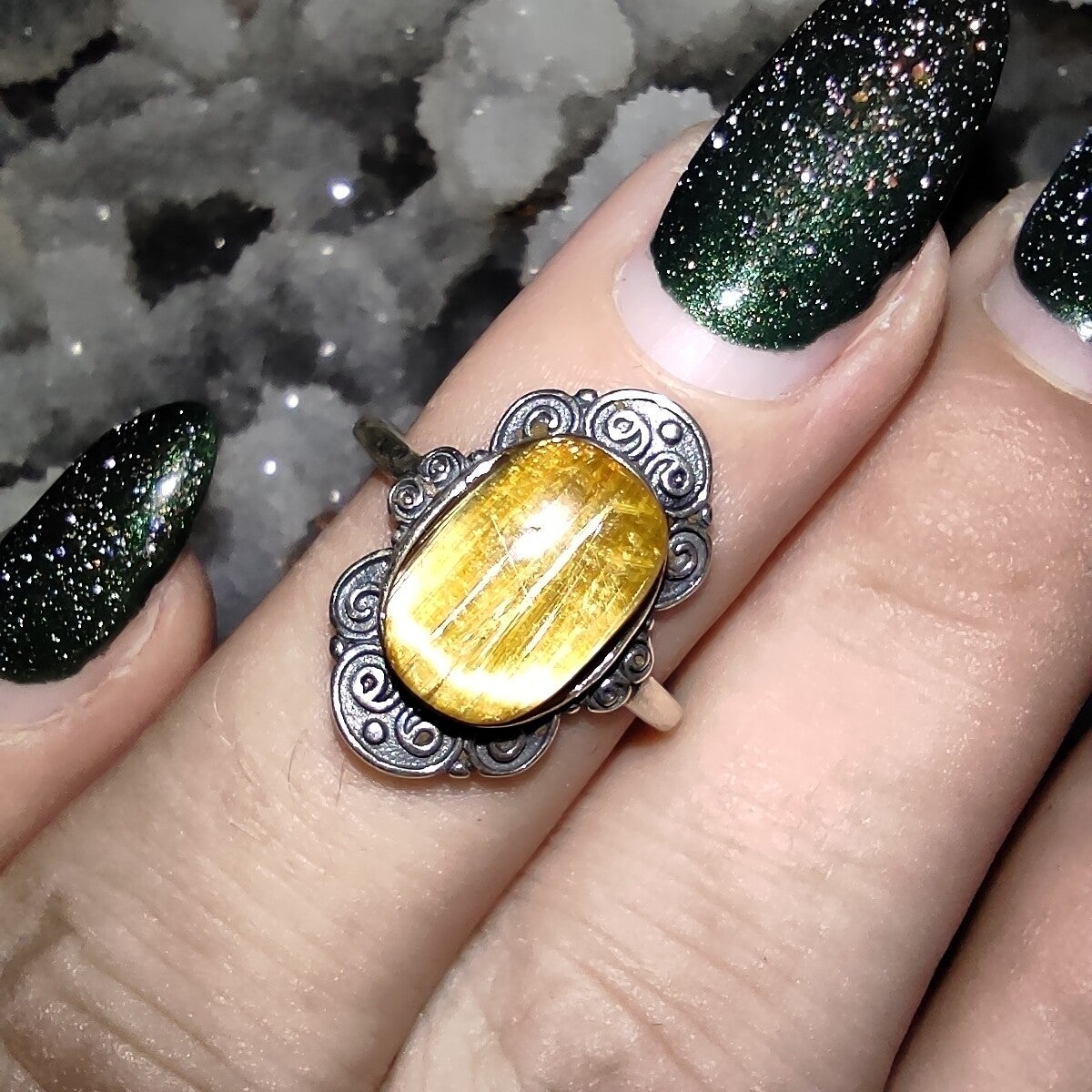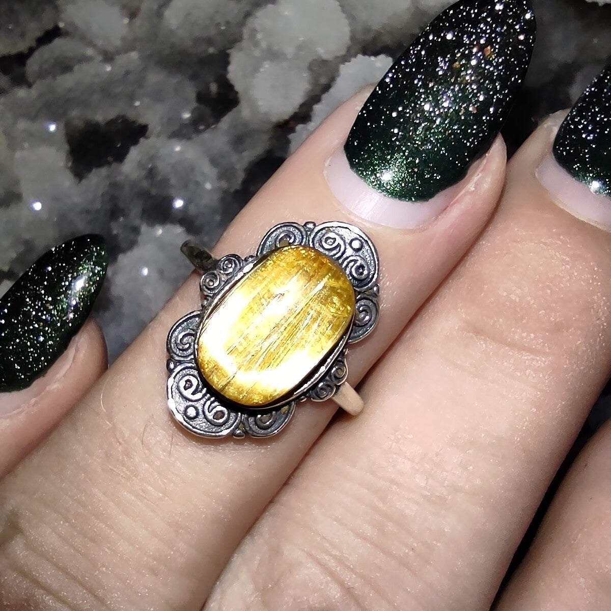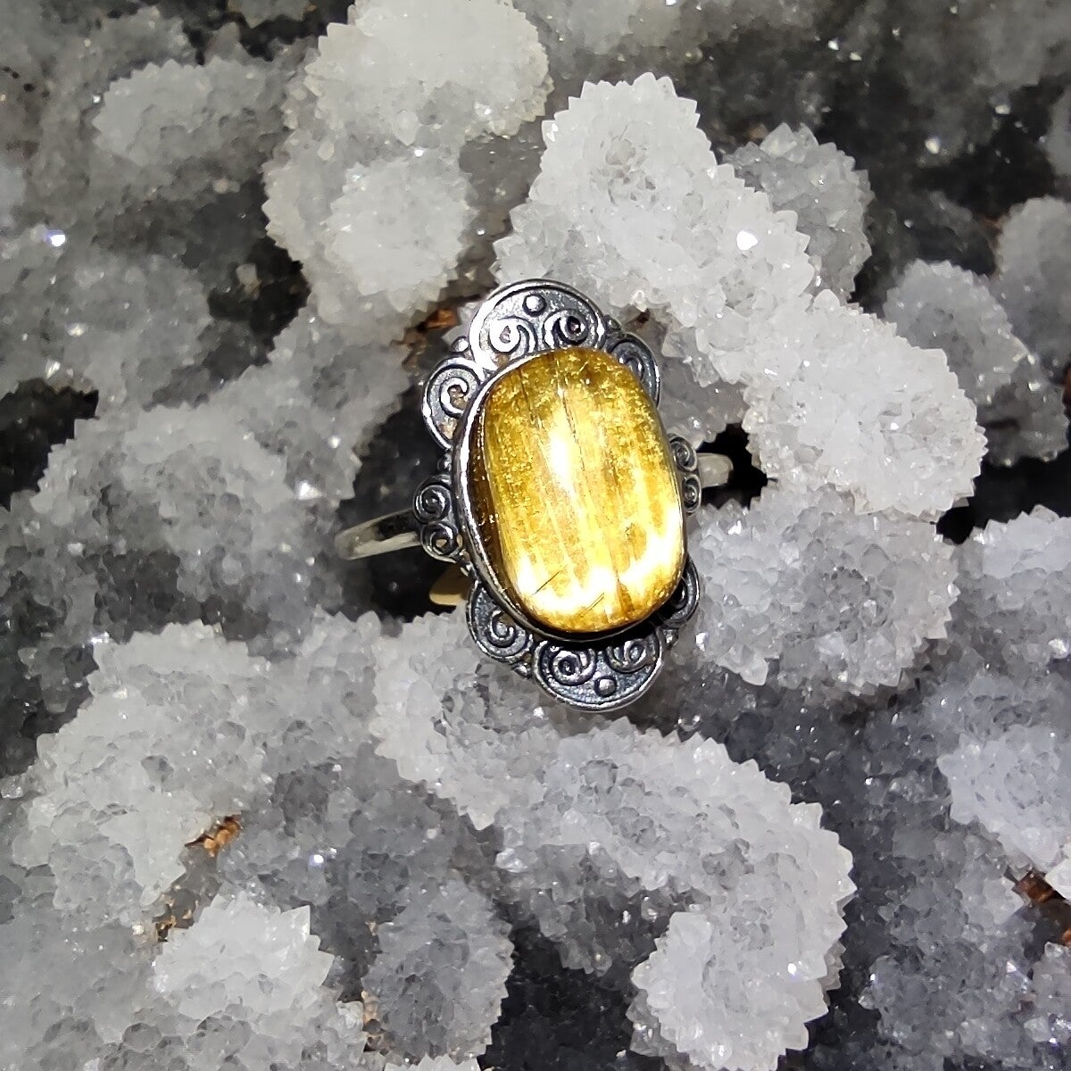 Prachtige Zilveren Ring (925 zilver) met Goud Rutiel Kwarts ingelegde steen.