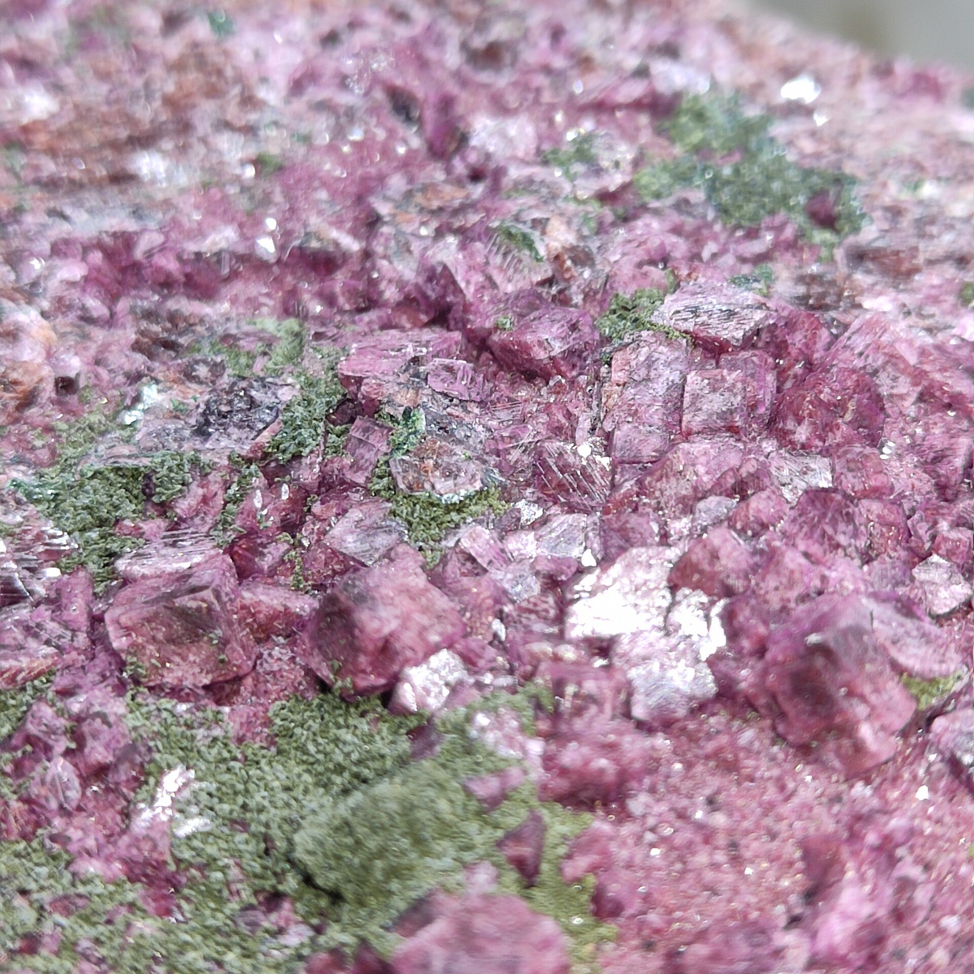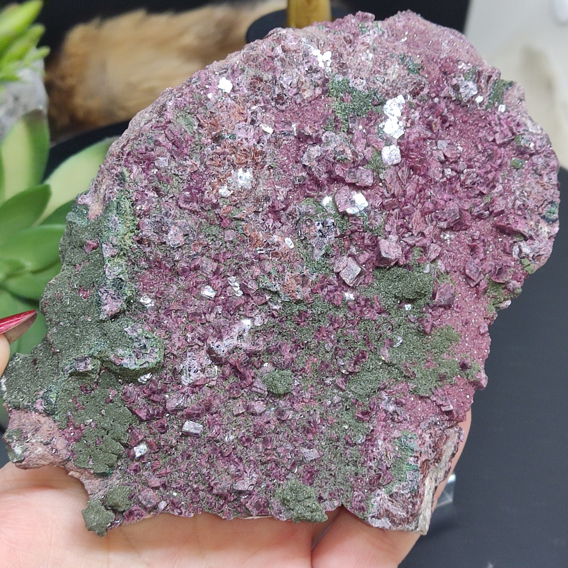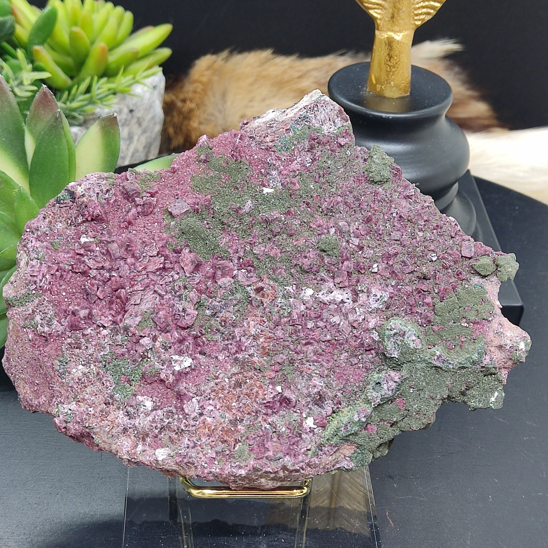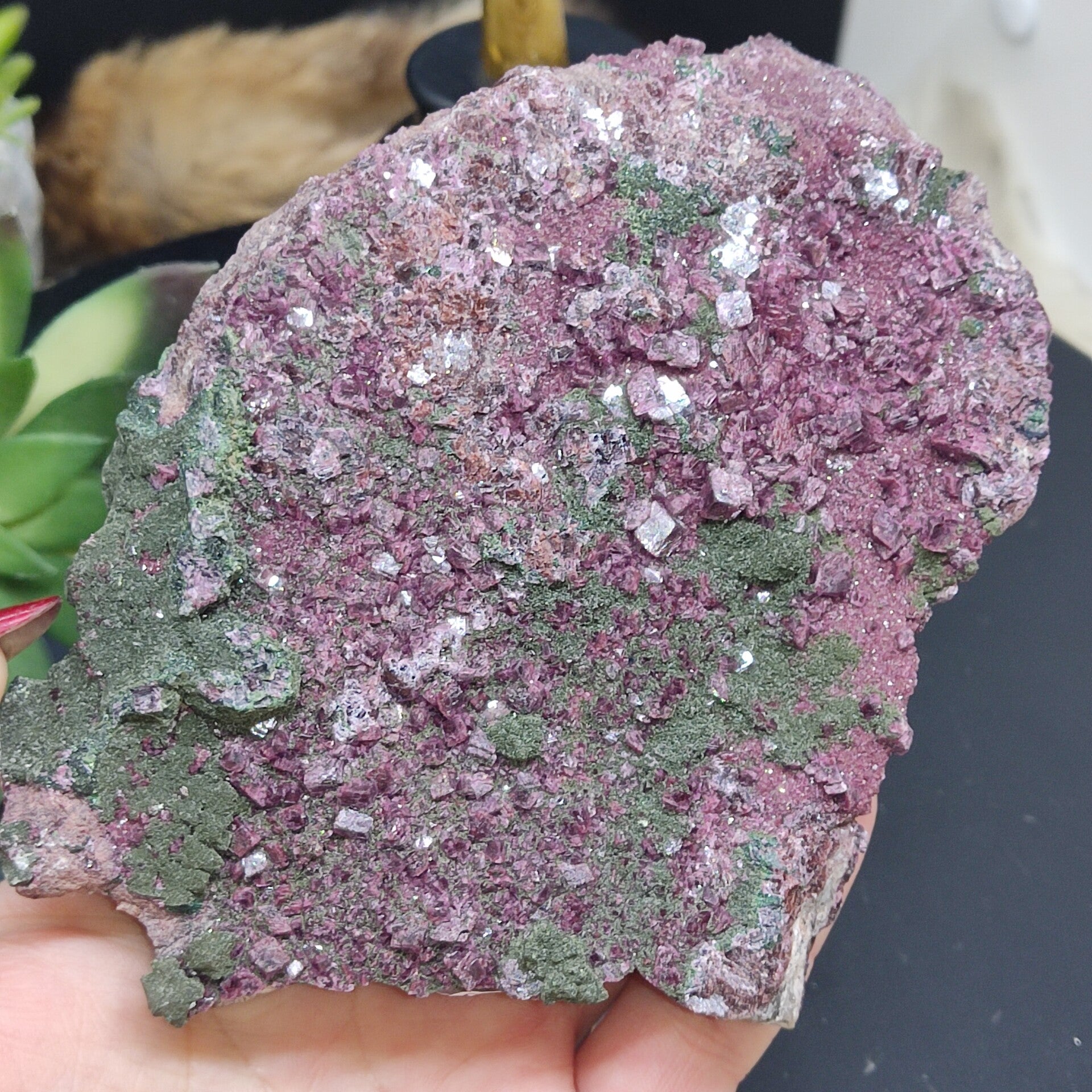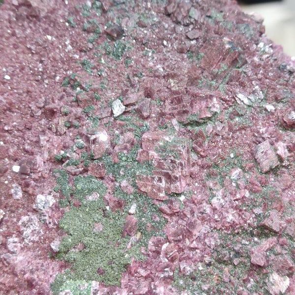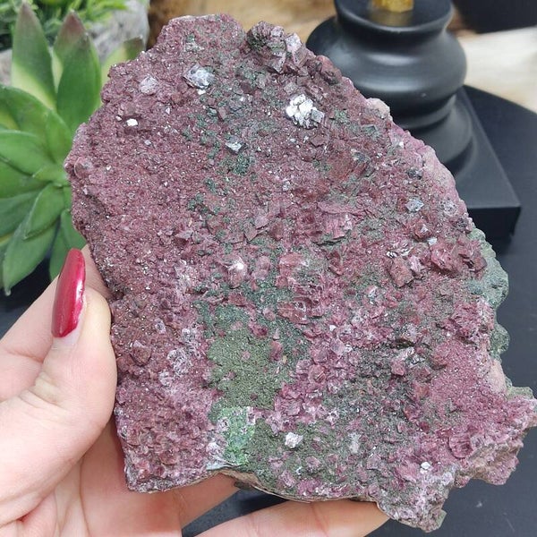 Dit ruwe cluster met prachtige grote dieproze kristalgroei en combinatie met malachiet is 451 gram en 14x11 centimeter.